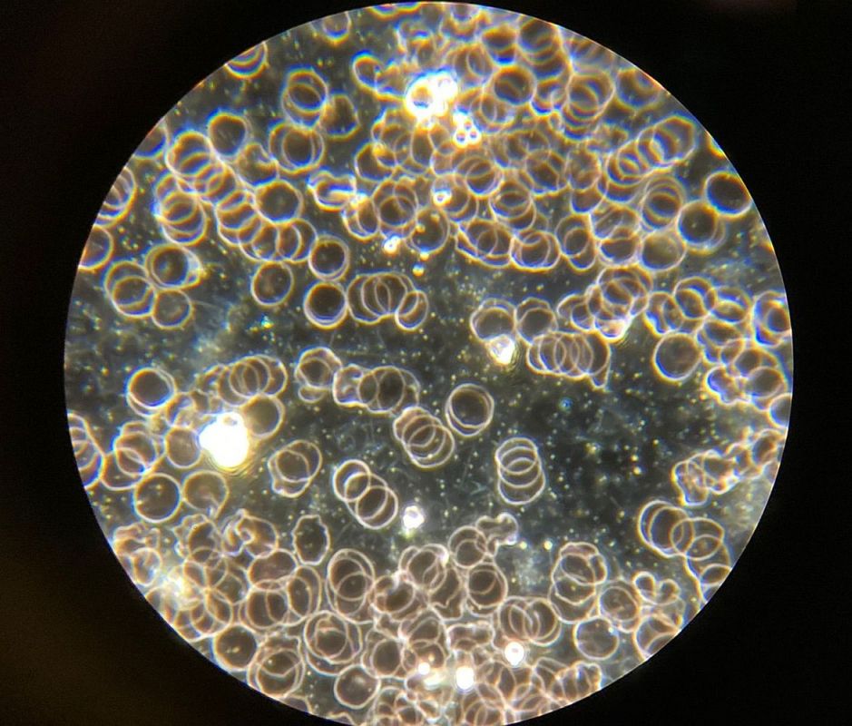 Mit Hilfe einer 1200-fachen Vergrößerung können wir das lebendige Blut genau beobachten. Zu sehen sind Mikroorganismen und alle Blutzellen.